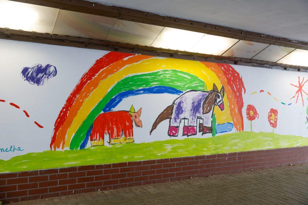 jak i artystyczną, a nawet terapeutyczną jest cykl murali, które powstały w przejściu podziemnym przy ul. Chorzowskiej. W ten sposób dzięki Fundacji ISKIERKA i Akademii Sztuk Pięknych w Katowicach dzieci z oddziałów onkologicznych mogły przenieść swoje emocje, marzenia i nadzieje na miejskie ściany.