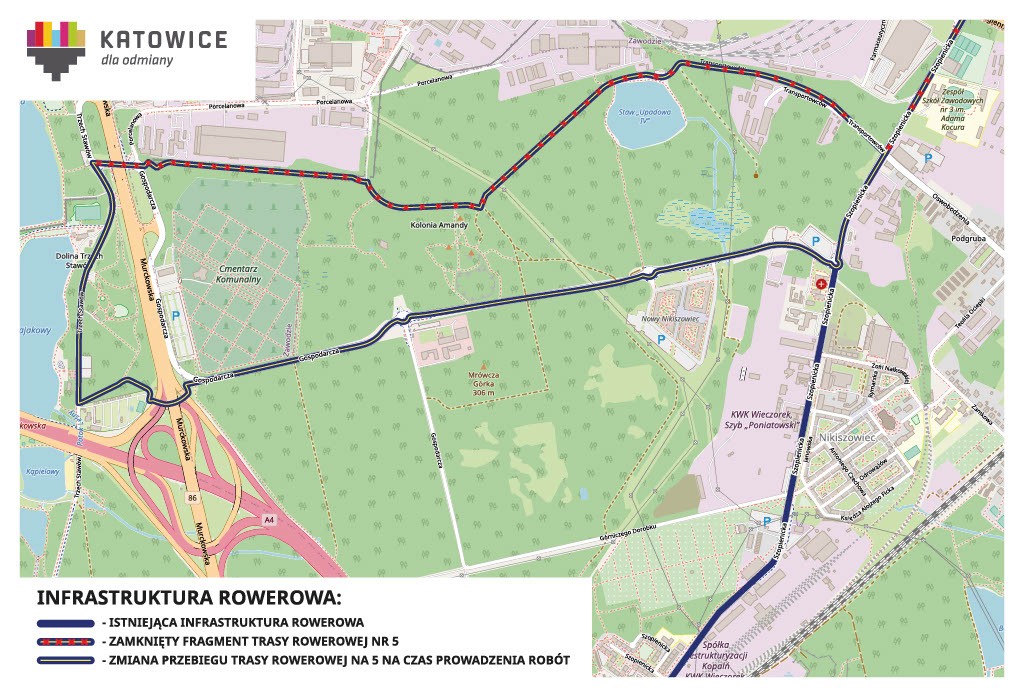 Trasa rowerowa nr 5 na czas robót, które mają potrwać do września 2024 roku, będzie poprowadzona drogą rowerową wzdłuż ul. Gospodarczej. Rowerzyści jadący z kierunku Doliny 5 Stawów po dotarciu do ul. Szopienickiej będą mogli pojechać na północ w stronę Nikiszowca lub na południe, by dojechać do dzielnicy Giszowiec.